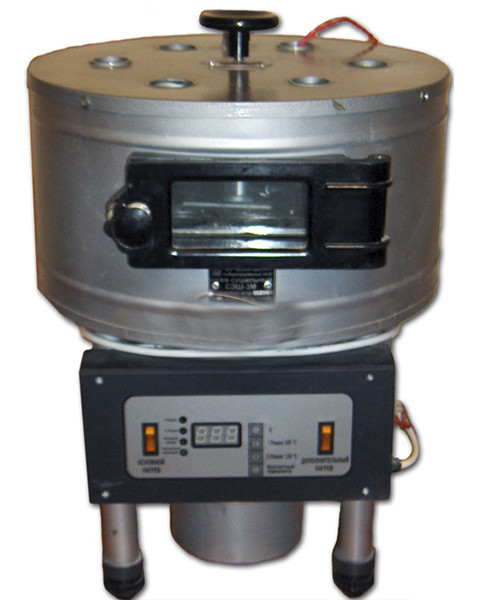 Нагреватель состоит из двух секций: основная мощностью 575 Вт и дополнительная 525 Вт. Дополнительную секцию включают для ускоренного разогрева шкафа до температуры 140 °С В соответствии с принятой методикой определения влажности в крупнозернистых продуктах перед сушкой их необходимо размолоть. Однако при размоле влажного зерна свыше 18% наблюдаются потери влаги. Чтобы избежать этого стандартом предусмотрено предварительное подсушивание продукта в сетчатых бюксах, прилагаемых к шкафу. Подсушенный продукт затем охлаждают в АУО-1, представляющем собой полый цилиндр, верхняя часть которого закрыта крышкой. На крышке шесть сетчатых гнезд. Одновременно можно охладить предварительно подсушенные шесть навесок продукта.